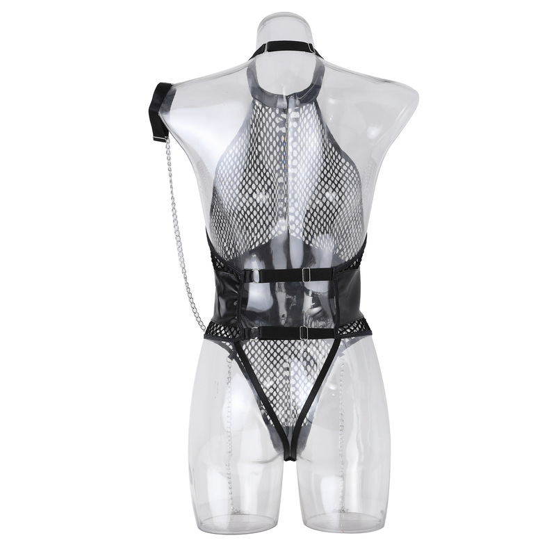 Vores mesh- og PU-lædersyede sexede jumpsuit er et must-have for enhver undertøjsforhandler. Denne jumpsuit har håndjern med kædehals, åben ryg og ingen hofter, hvilket giver et modigt og fristende look. Perfekt til kunder, der søger det seneste inden for lingerimode.