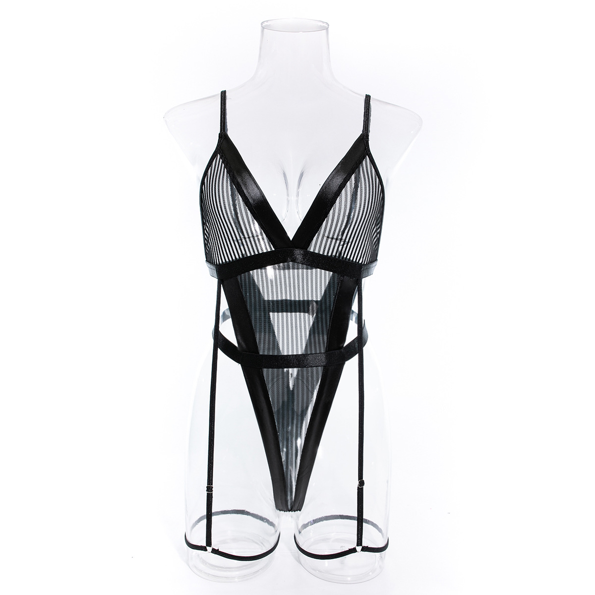 Tauchen Sie ein in die kühne Eleganz unseres gestreifter Body, ein fesselndes Ensemble im durchsichtigen Halbbrust-Design mit offenem Rücken und Strapshaltern in elegantem Schwarz.