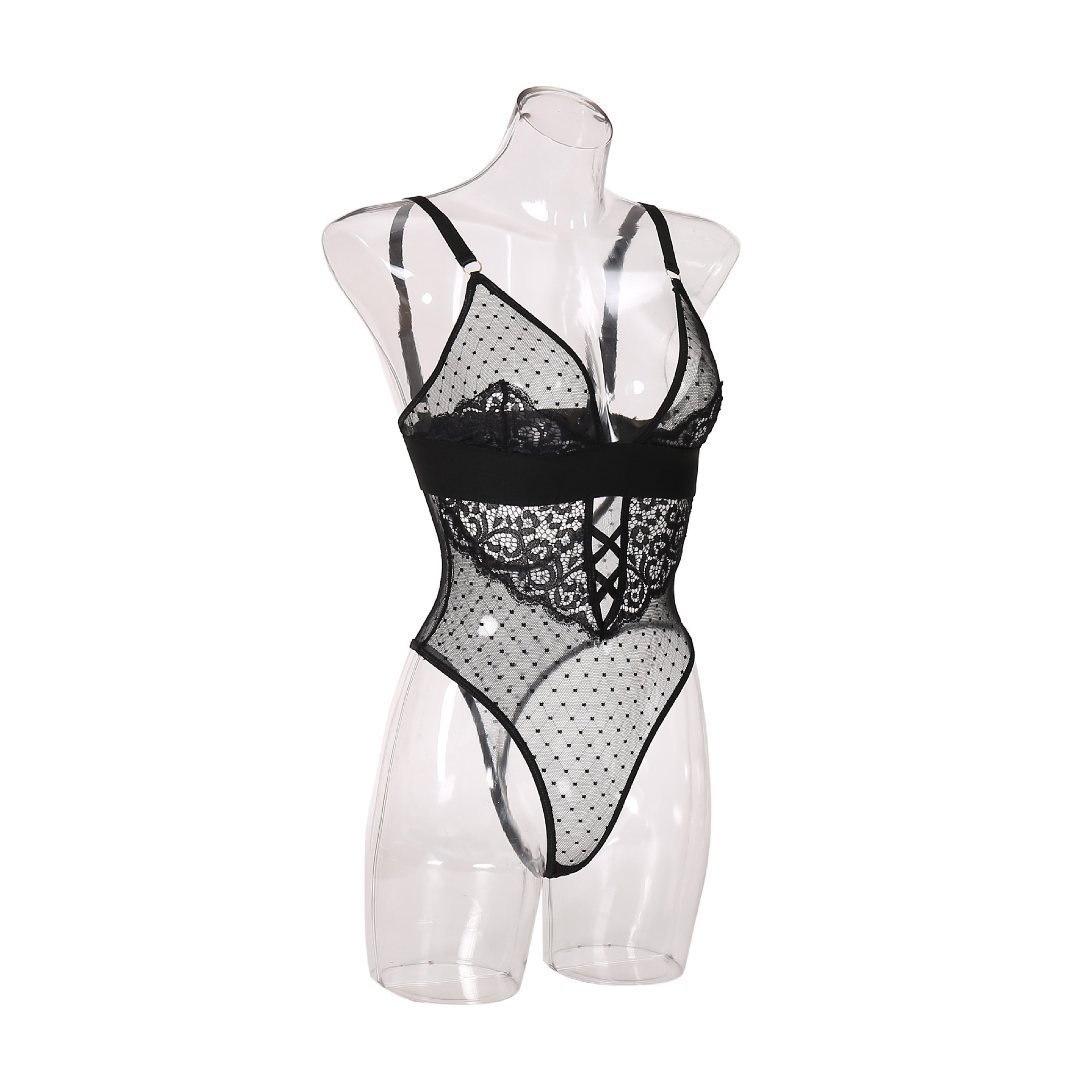 Intriga delicada: Este body, elaborado magistralmente con encaje fino, presenta un escote profundo que llama la atención, equilibrado por la elegancia del patrón de la tela para una apariencia verdaderamente cautivadora. cuerpo de encaje negro.