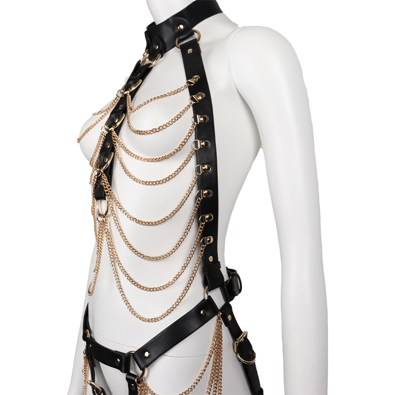 Rohkea ketjutyyli: Tämä ainutlaatuinen nahkainen bondage-alusasu nostaa aistillisuuden uusiin korkeuksiin monimutkaisilla ketjuyksityiskohtillaan. Täydellinen niille, jotka haluavat ilmaista tyyliään luottavaisesti, se ilmentää sen olemusta seksikkäät dominatrix-vaatteet, joka tarjoaa unohtumattoman visuaalisen vaikutelman.