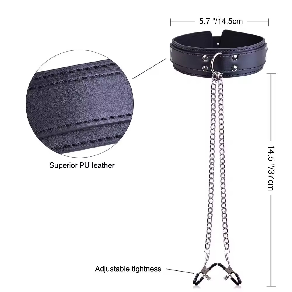 Elävät värivaihtoehdot: Mustan, punaisen ja vaaleanpunaisen vaihtoehdon ansiosta tämä kaulus- ja nännipidikesarja sopii henkilökohtaisiin mieltymyksiin tai pelitilanteisiin, mikä mahdollistaa BDSM-kokemuksen mukauttamisen.