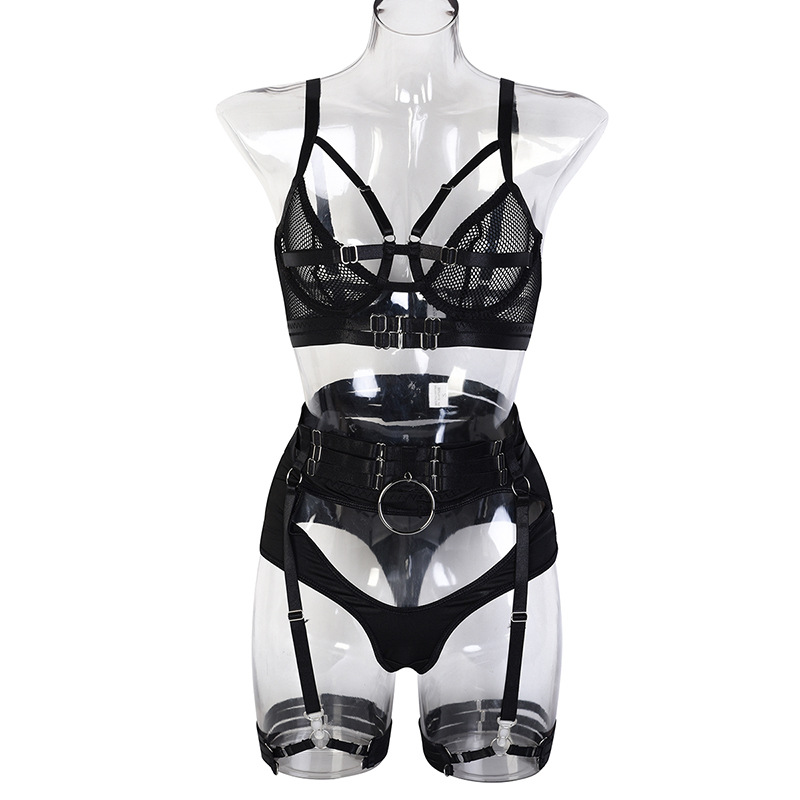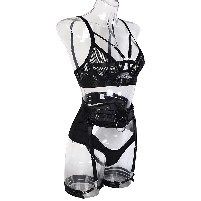 En conclusion, notre ensemble soutien-gorge et culotte transparents avec ceinture tissée à trois couches et anneau central en métal équilibre parfaitement design audacieux et confort. Ses éléments uniques lui permettent de se démarquer dans n'importe quelle collection de lingerie.