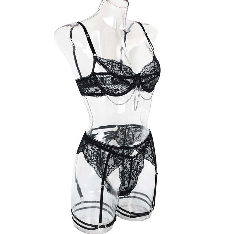 En conclusion, l'ensemble de soutien-gorge en dentelle avec découpe buste, chaîne en métal et culotte string offre un mélange parfait de design audacieux, de confort et de détails méticuleux. Ses caractéristiques uniques et son style tendance en font un ajout remarquable à toute collection de lingerie.
