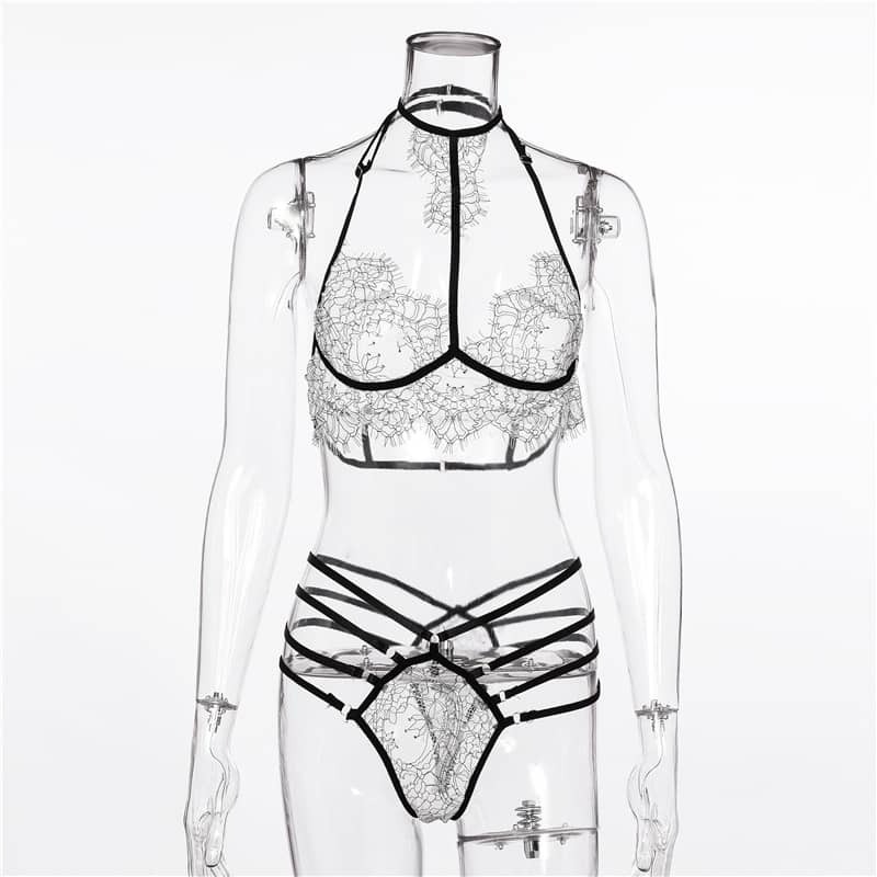 Deixe seu ente querido pegar você com o conjunto de lingerie sexy de sutiã de renda frente única. Feito de renda branca de alta qualidade, sutiã halter com cílios, alças estreitas ajustáveis em forma de corredor, calcinha com 4 alças finas trançadas.