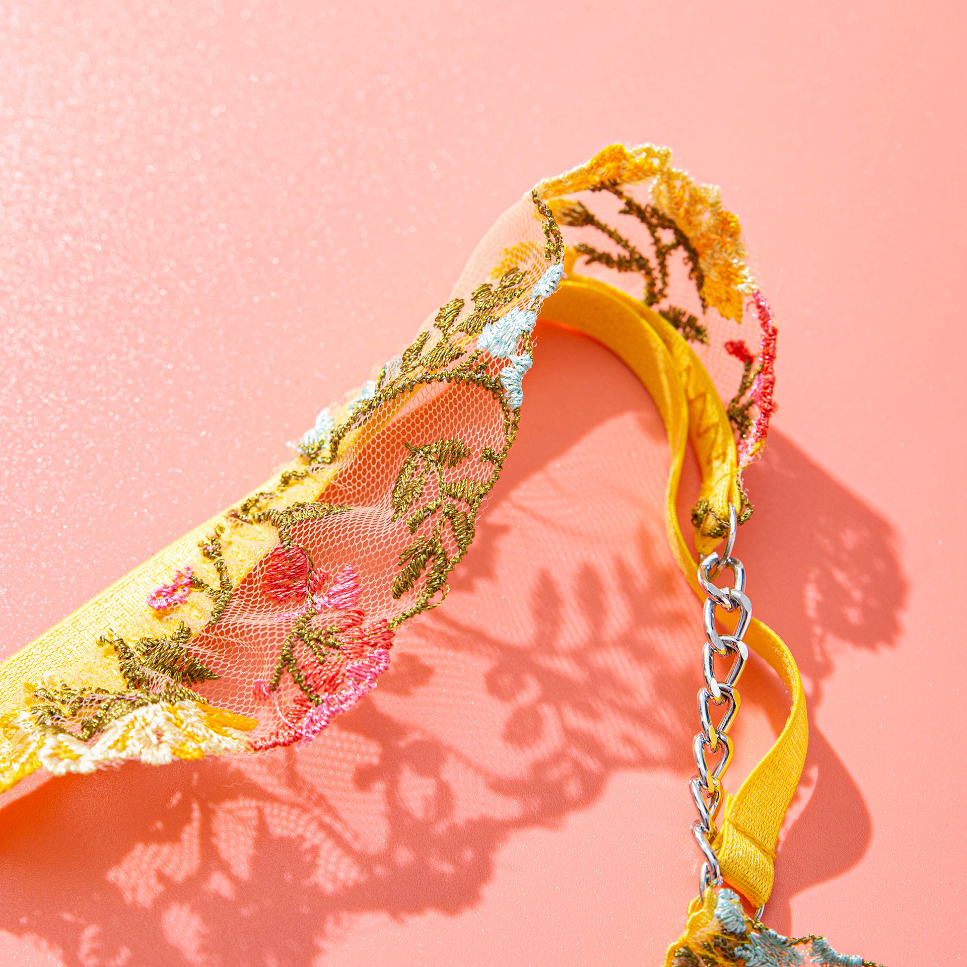 Яркая элегантность: Верх-корсет украшен богатой цветочной вышивкой, создающей пышный сад цветов на солнечном желтом фоне. Этот изысканный дизайн делает изделие выдающимся роскошный комплект нижнего белья для тех, у кого есть вкус к прекрасным вещам.