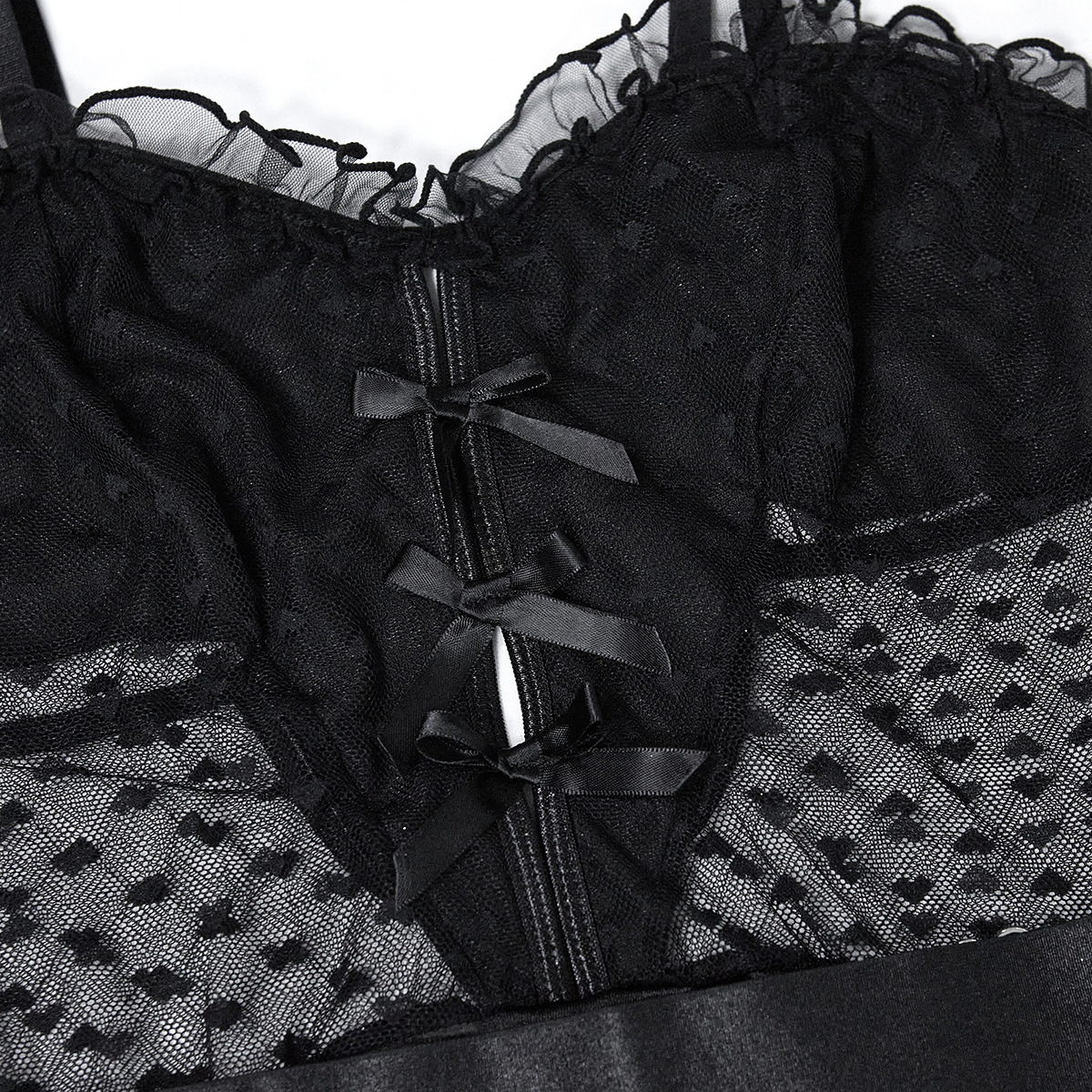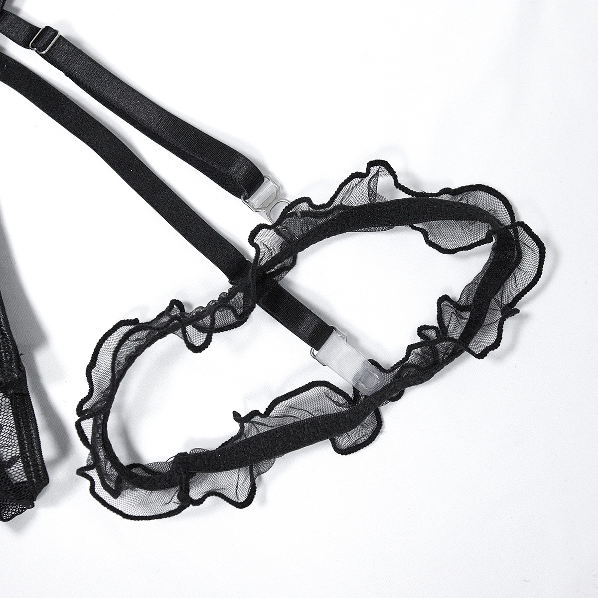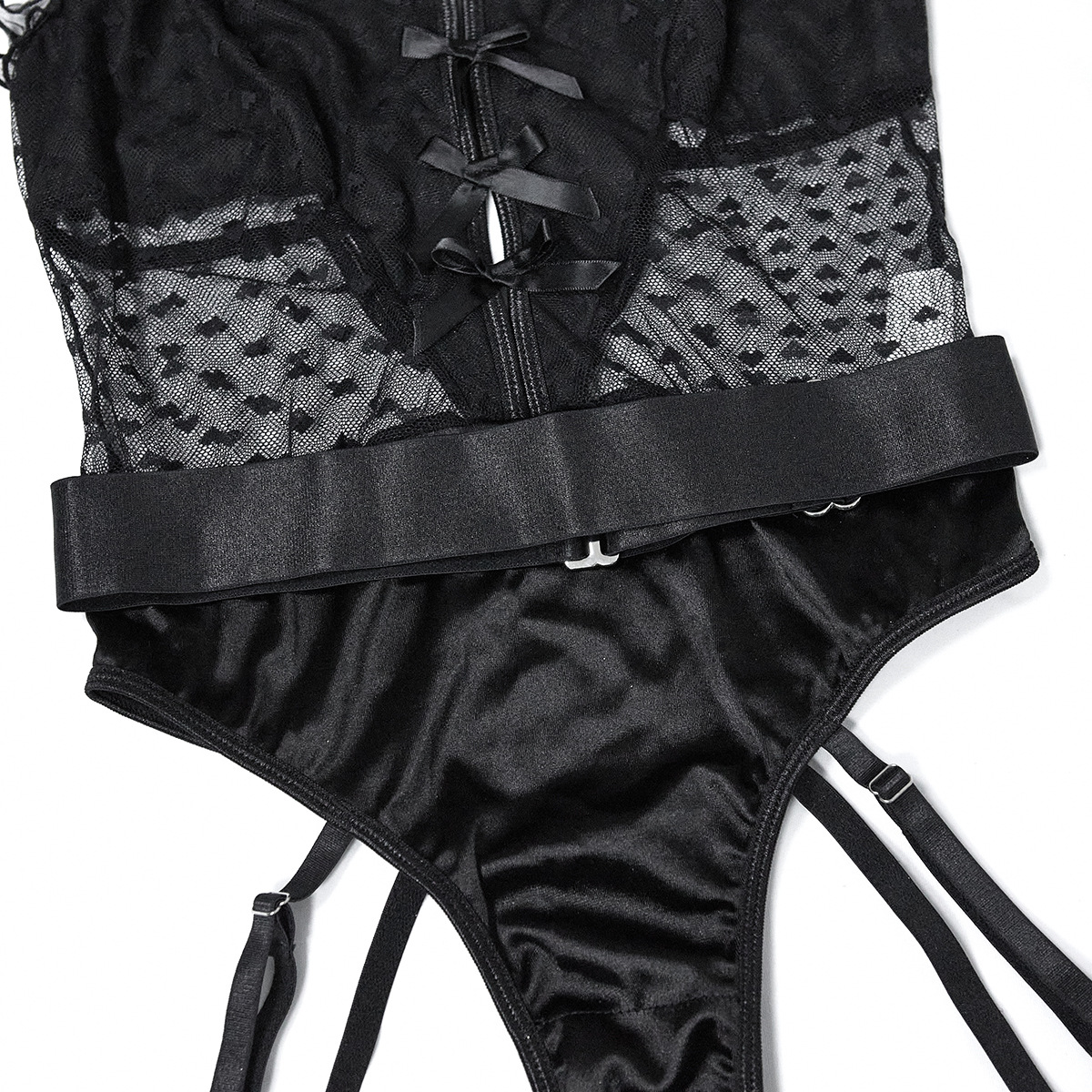 Kliv in i en värld av elegans med vår Garter Bodysuit, ett underverk i ett stycke prydd med en charmig bröstbågedekoration. Tillverkad av kärleksfläckig mesh och med mesh-benringar, är denna bodysuit en symbol för nåd och lockelse, perfekt för de speciella stunderna.