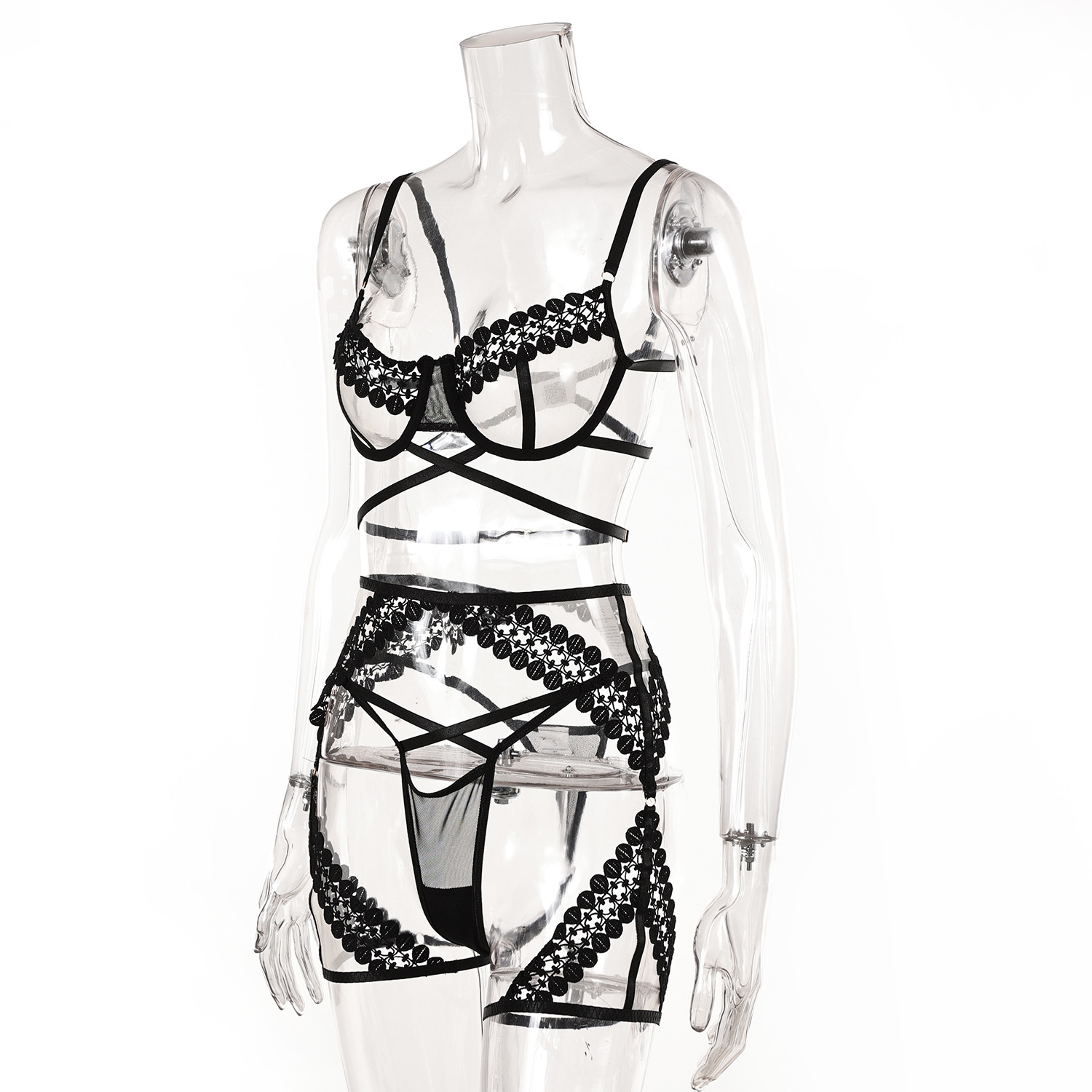 Kantad i elegans: Varje del är kantad med prydnadsdetaljer, som presenterar ett intrikat spel av skugga och ljus, vilket gör detta BH och trosa genomskinlig gör ett fängslande val för alla intima tillfällen.